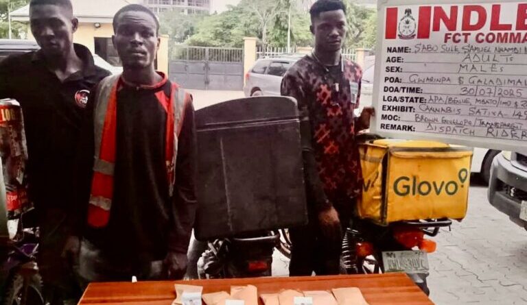 ” In Abuja, the nation’s Federal Capital Territory, NDLEA operatives conducting intelligence-led stop and search operations in Gwarimpa, Jahi, and Galadimawa areas of the FCT on Wednesday 30th July arrested three dispatch riders: Sabo Sule, 24; Samuel Nnamdi, 28; and Idris Jibrin, 28, for distributing illicit substances around the city.